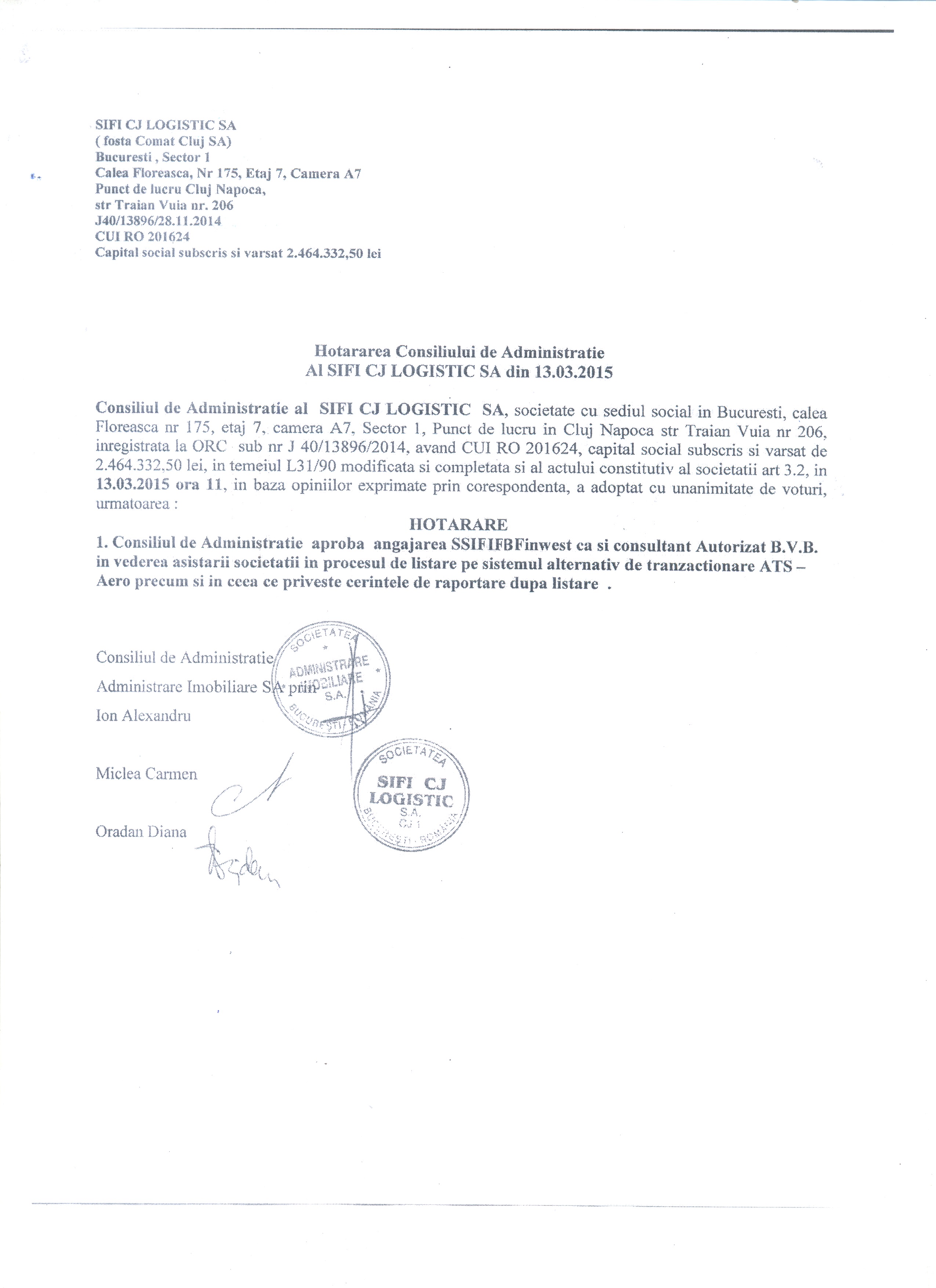 Hotarari CA din 13.03.2015 privind consultantul autorizat IFB FINWEST SA